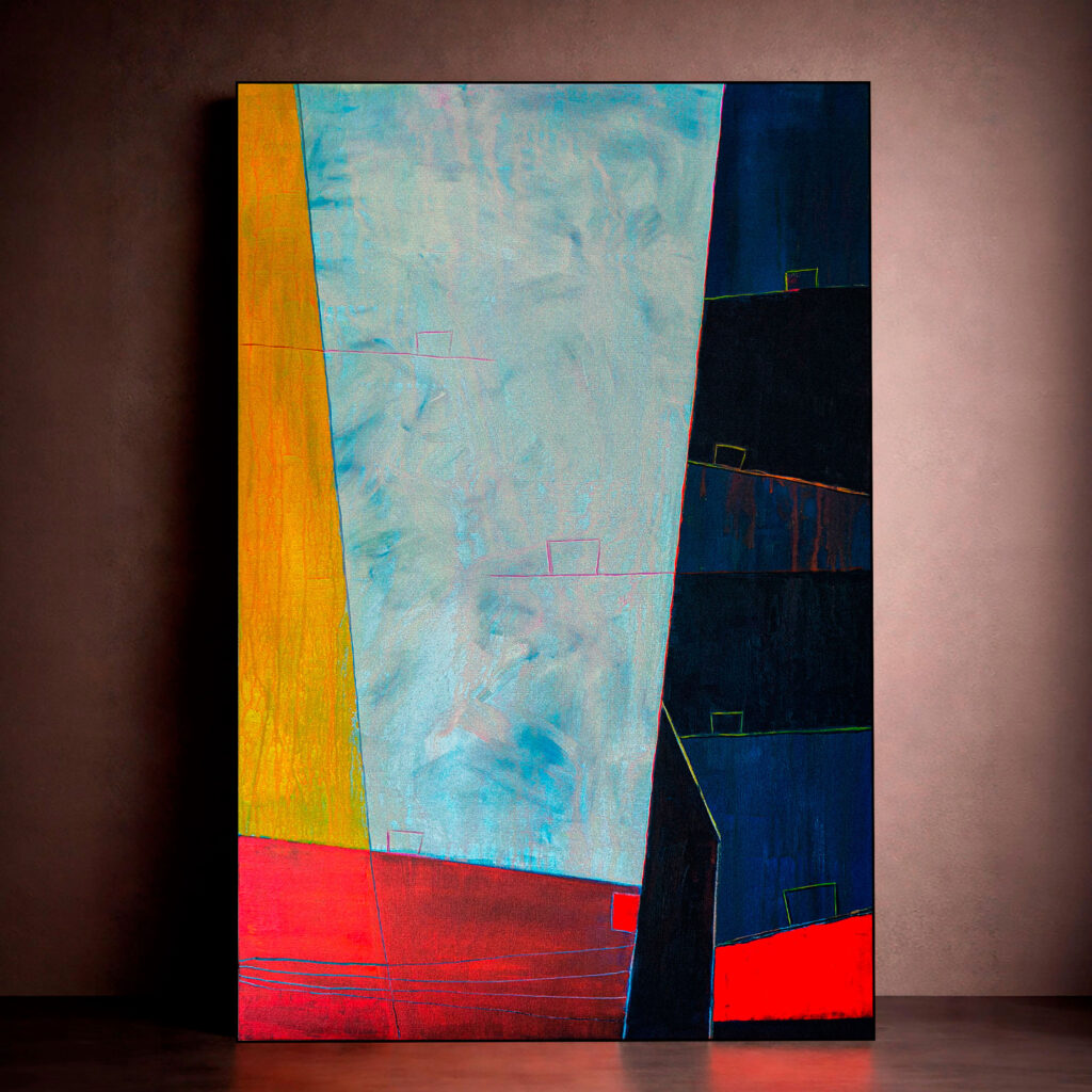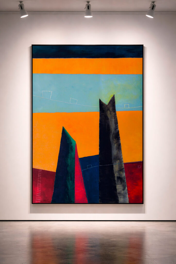 Each large-scale contemporary abstract painting functions as a cartography of consciousness: a spatial mapping of ego and ideological formations as geometric architectures. Defined horizons, controlled mass, and minimalist restraint establish equilibrium between void and presence. Verticality becomes tension; form becomes language.